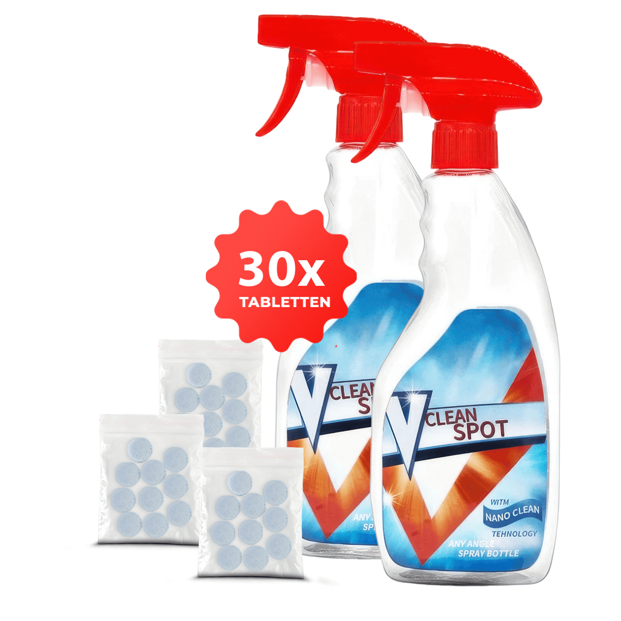 Het gebruik van Vclean Spot is eenvoudig. Vul de fles met 500 ml water, voeg één bruisende tablet toe, en wacht tot deze volledig is opgelost. Je bent nu klaar om te reinigen!