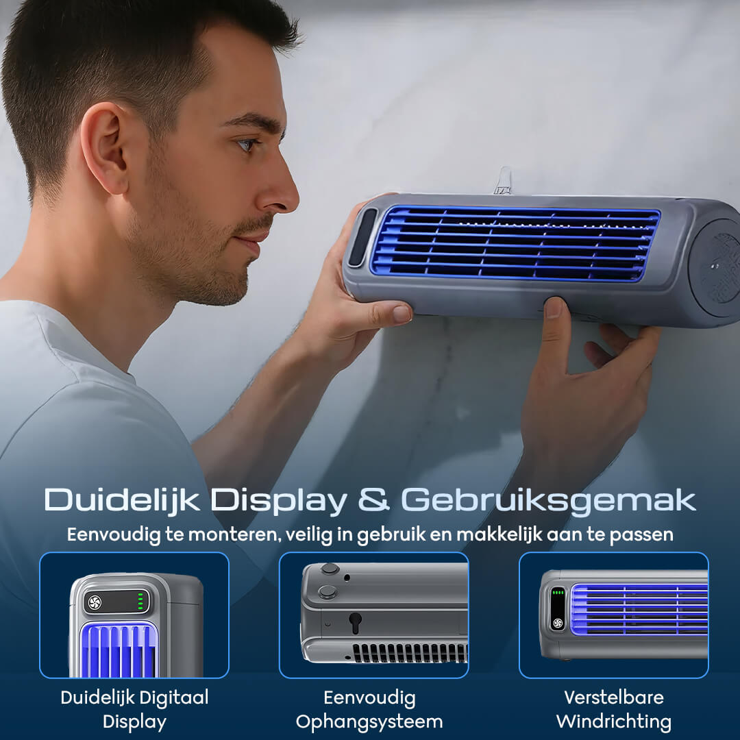 Zet ‘m op tafel voor directe verkoeling naast je, of hang ‘m eenvoudig aan de muur zonder te boren.