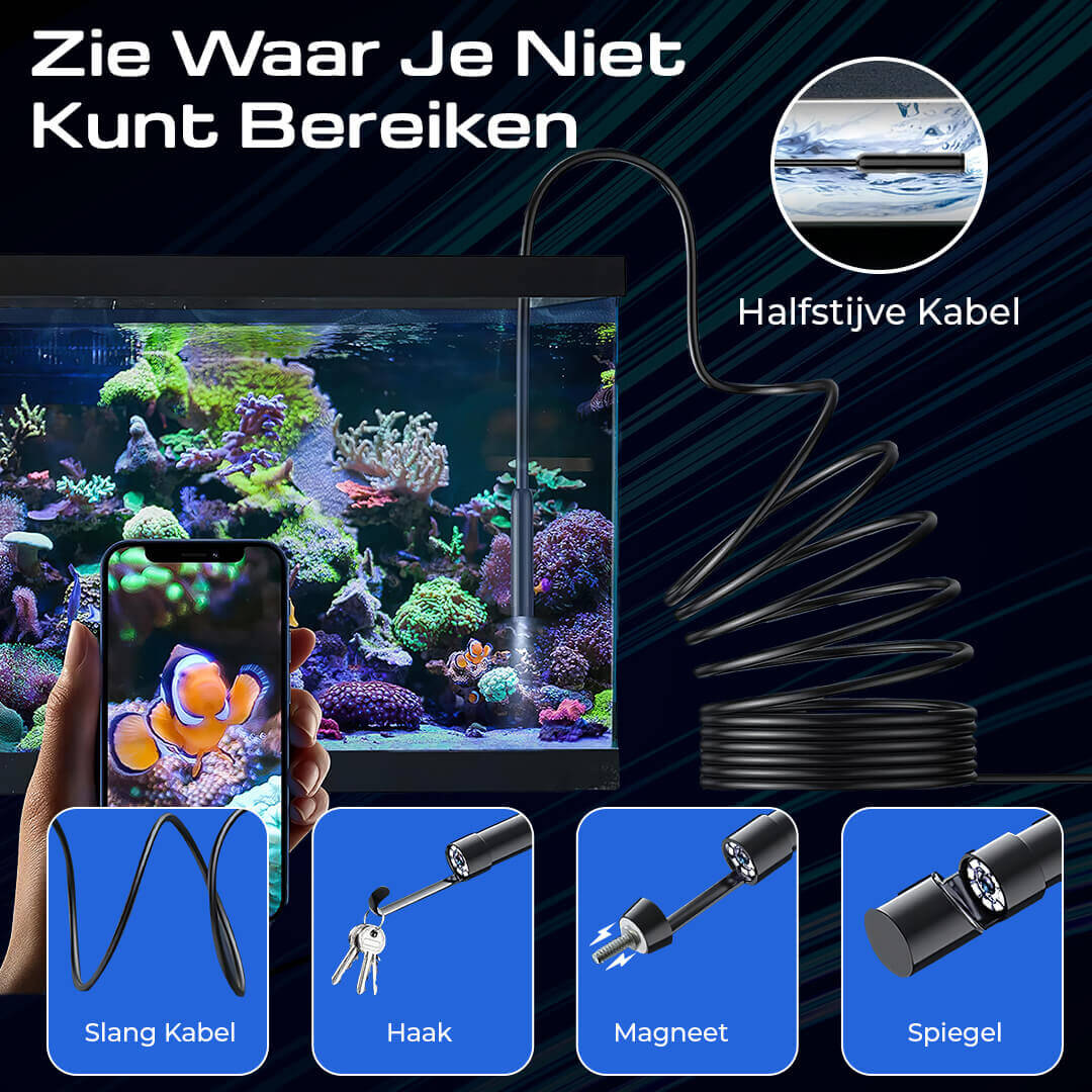 Sluit de camera direct aan op je telefoon, stuur de flexibele kabel richting het probleemgebied, en zie binnen 5 seconden precies wat er aan de hand is.