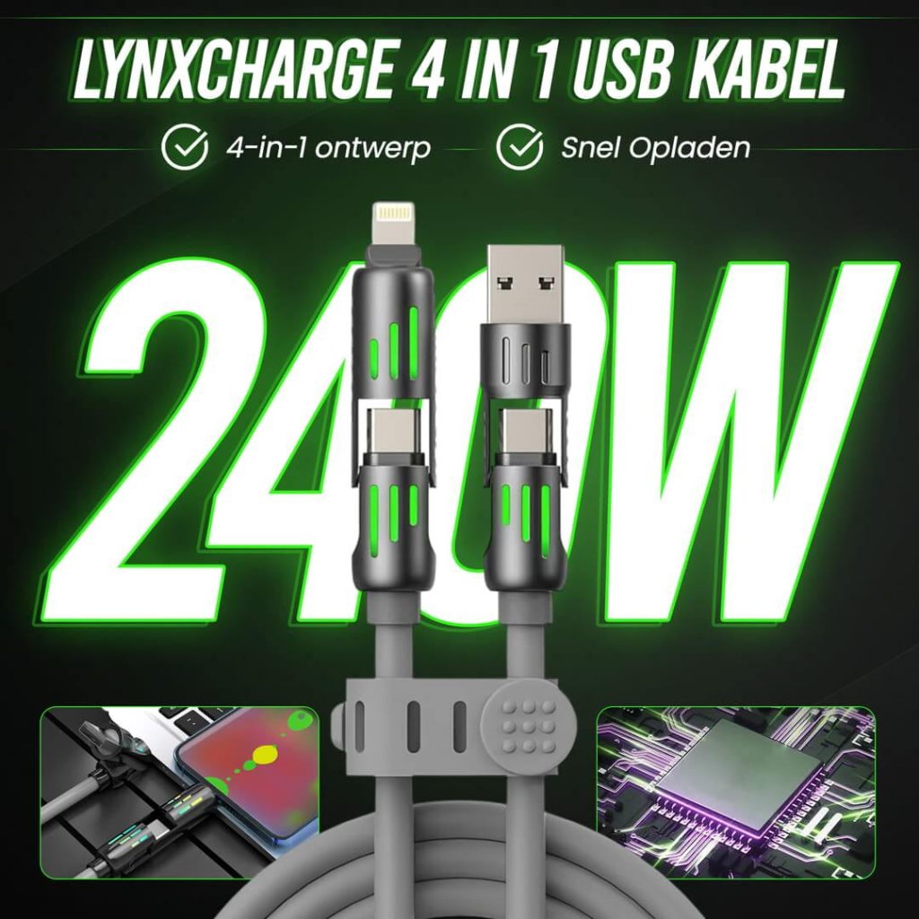 Stel je voor: één kabel voor al je apparaten! De LynxCharge 4-in-1 USB Kabel is dé oplossing voor iedereen die meerdere gadgets heeft.