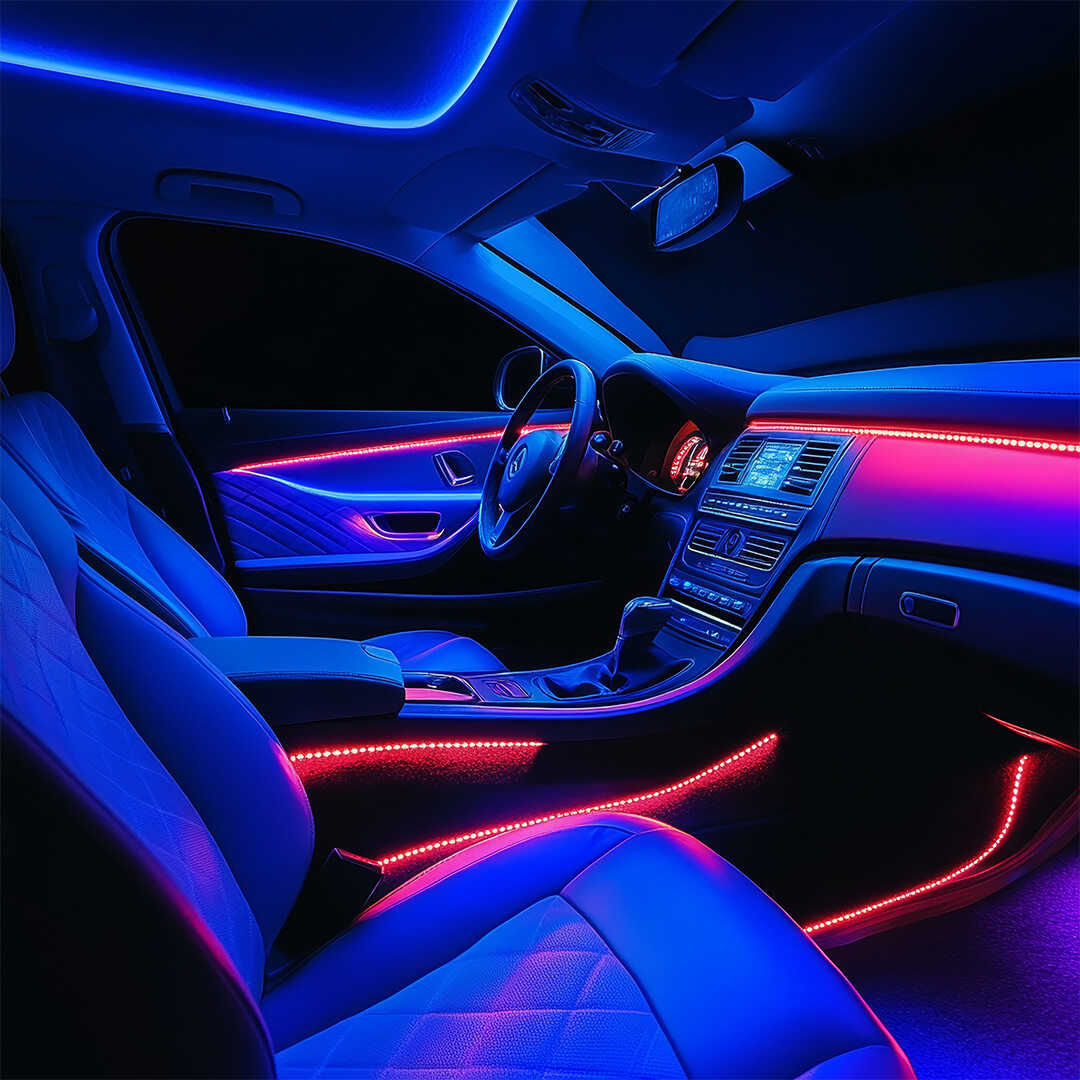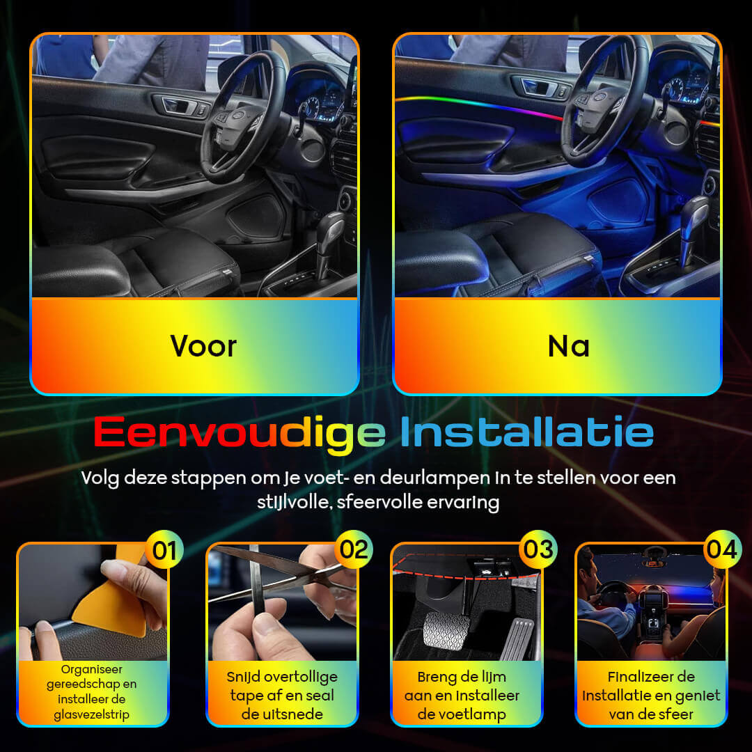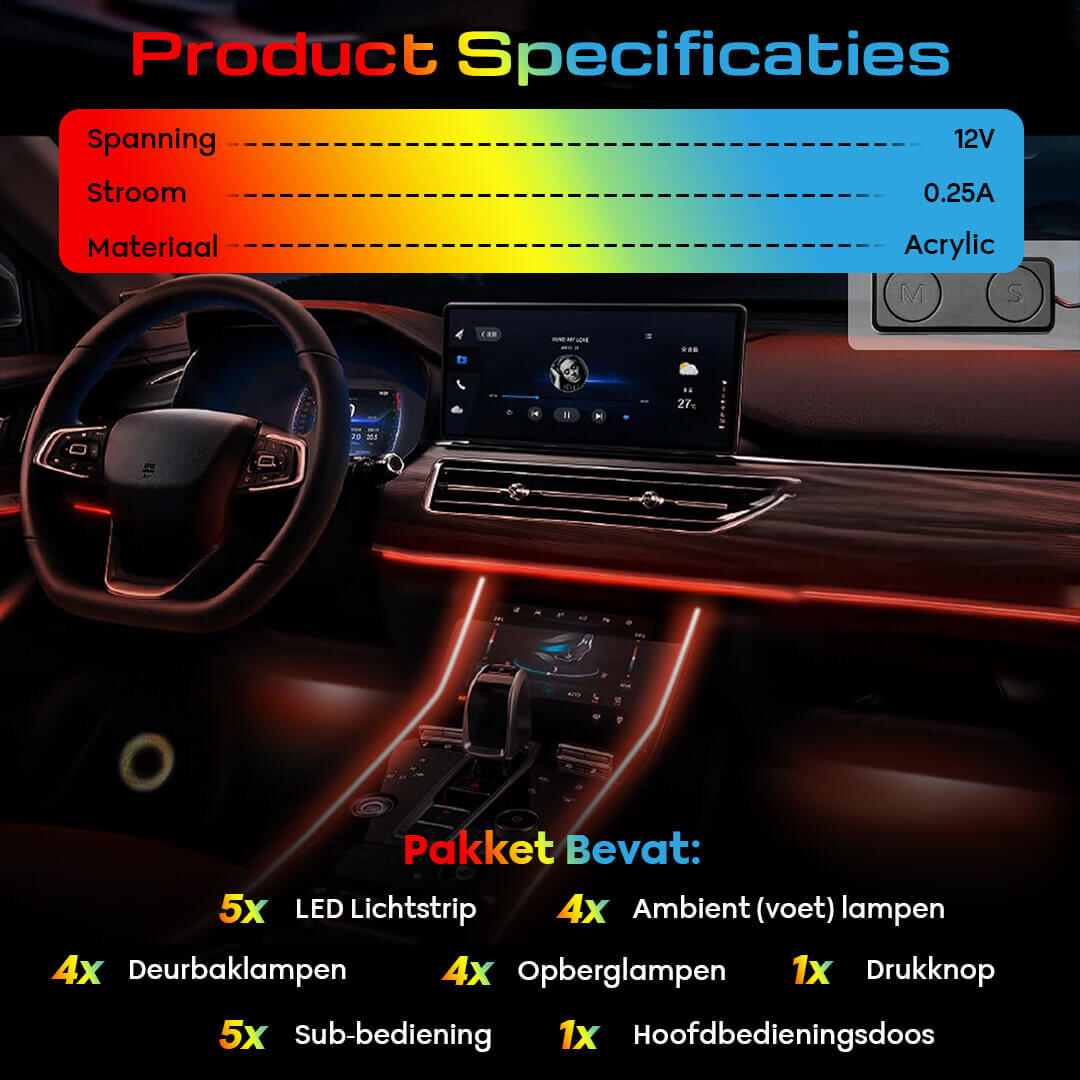 Kies uit miljoenen kleuren, geniet van spectaculaire lichteffecten en laat de verlichting dansen op de beat van jouw favoriete muziek. Jouw auto wordt een verlengstuk van je persoonlijkheid – en elke passagier zal onder de indruk zijn.