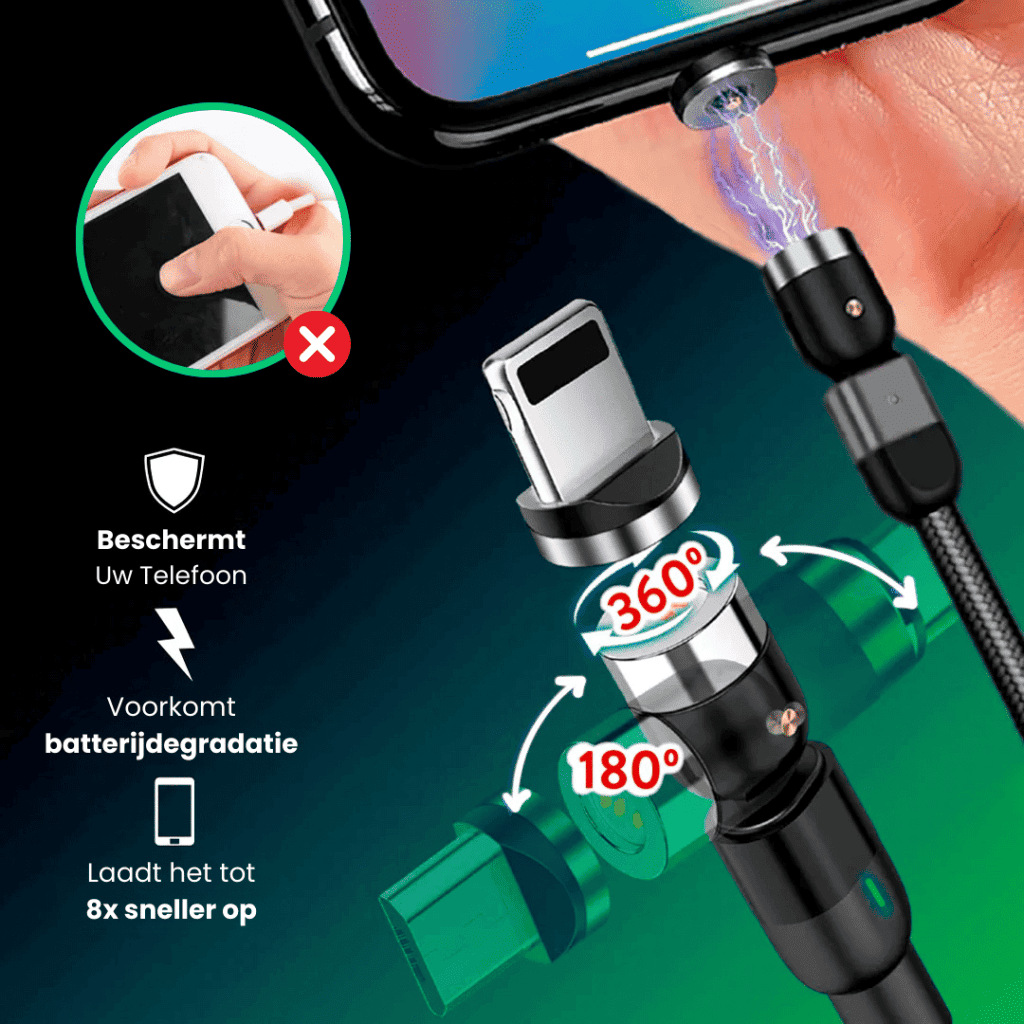 De Quickzap magnetische laadkabel transformeert jouw dagelijkse oplaadroutine. Met een 180°+360° rotatieontwerp en sterke magnetische bevestiging, biedt deze kabel niet alleen gemak maar garandeert ook een stabiele connectie.