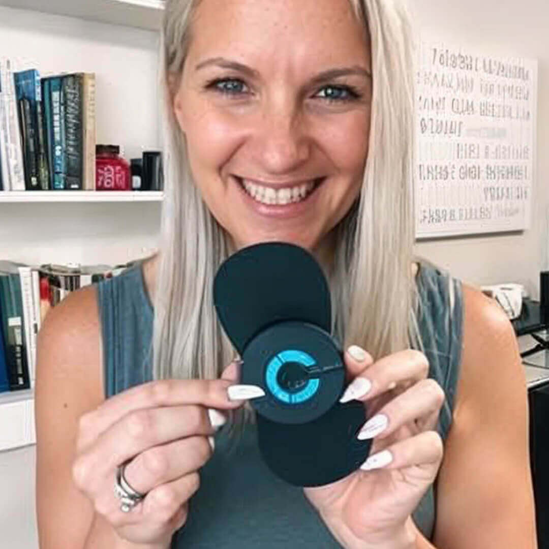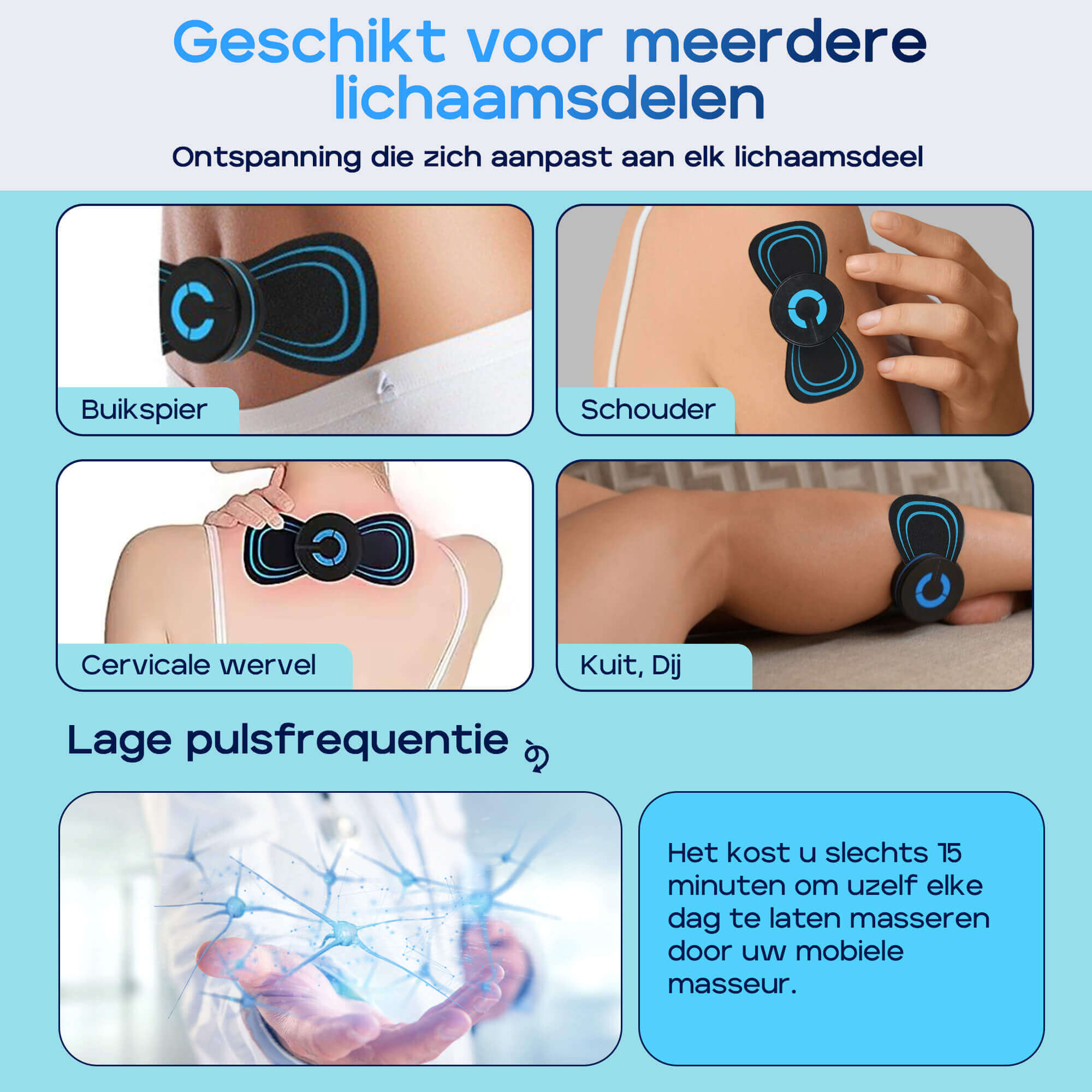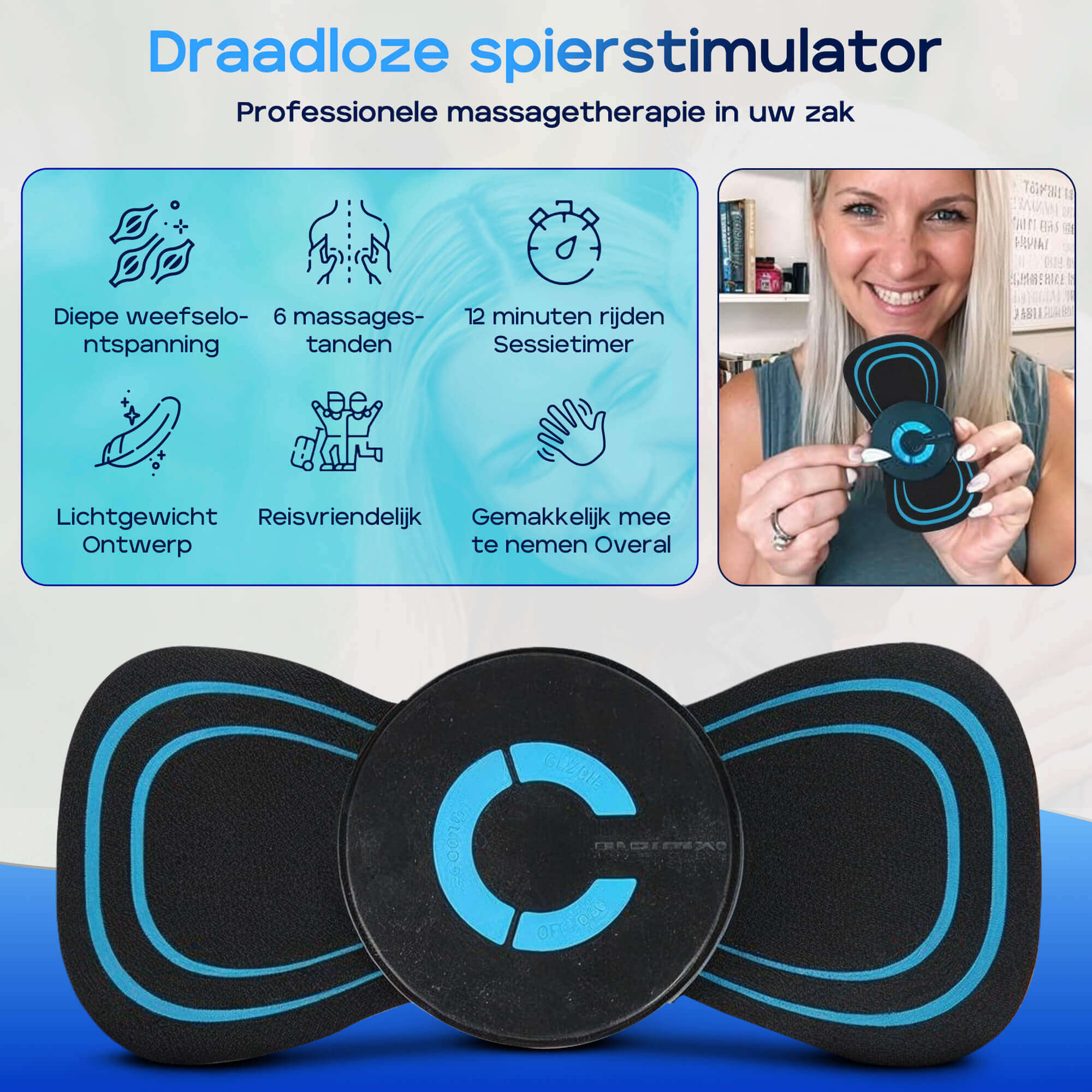 Ervaar de kracht van een draadloze spierstimulator die voelt als een professionele massage, maar past in je zak.