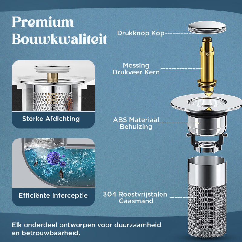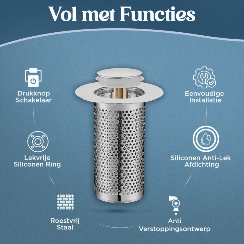 Met de handige drukknop schakel je moeiteloos tussen afsluiten en doorlaten, terwijl de siliconen anti-lekring en het anti-verstoppingsfilter zorgen voor een probleemloze afvoer.