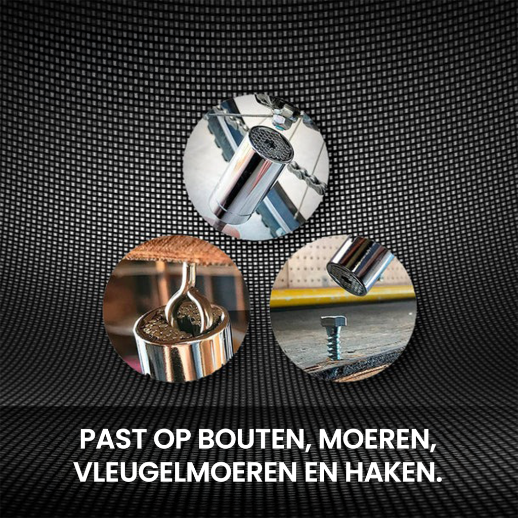✔ Altijd passend — van 7–19 mm, ook op vreemde vormen zoals haken en vleugelmoeren.