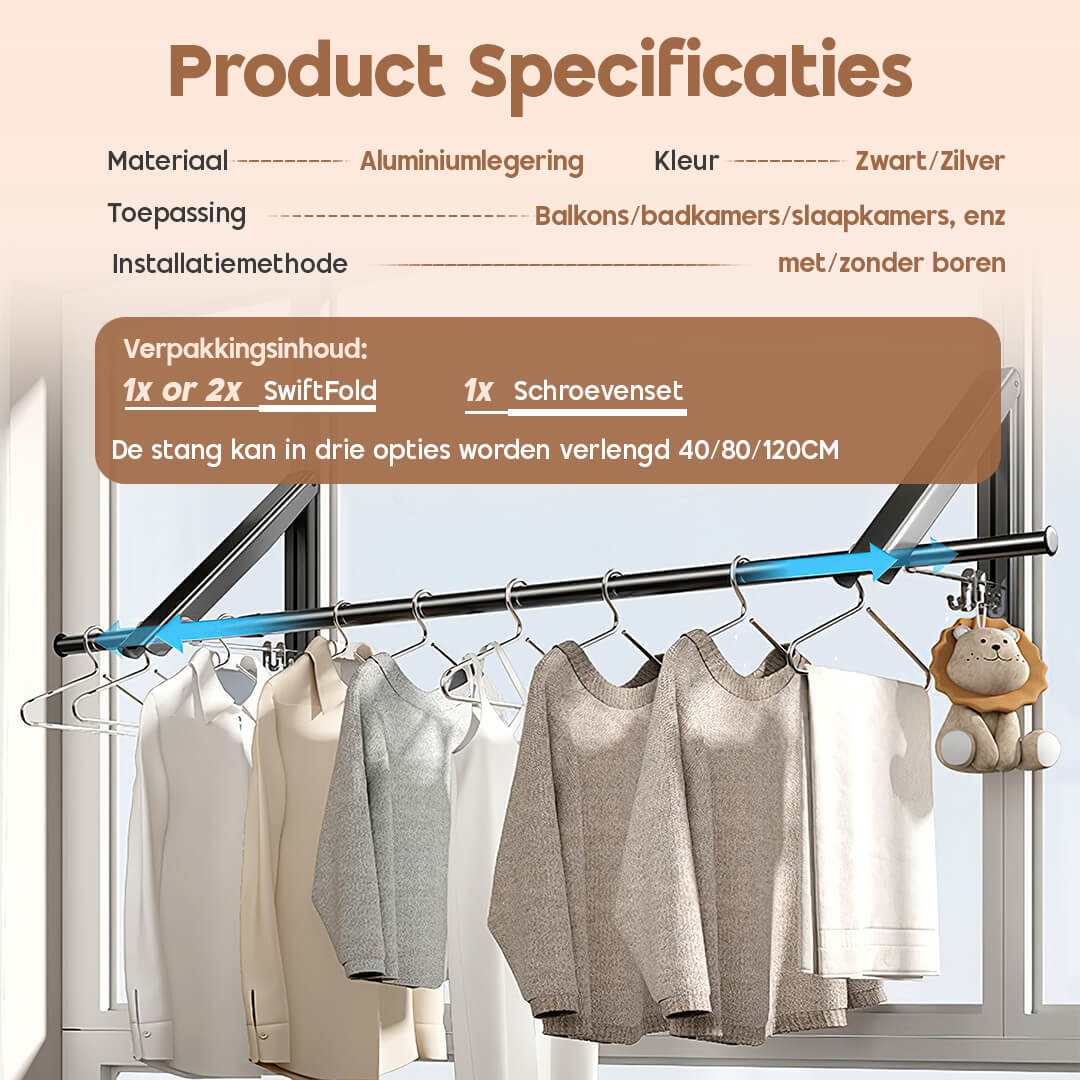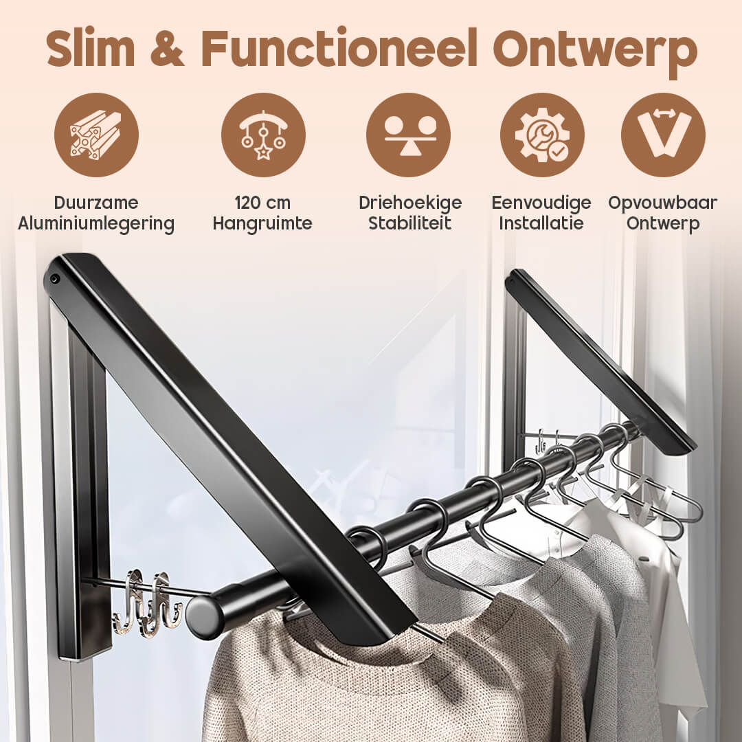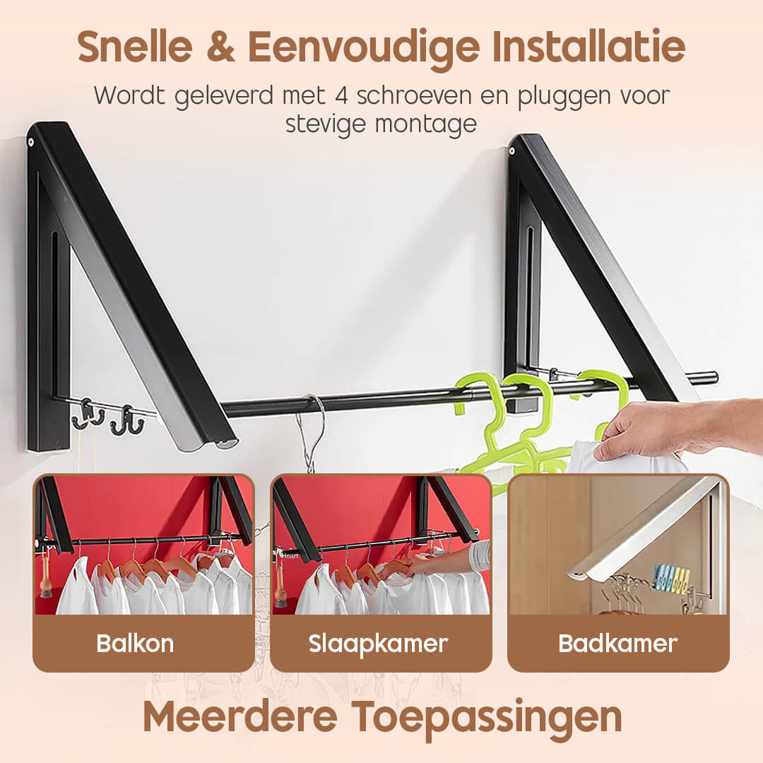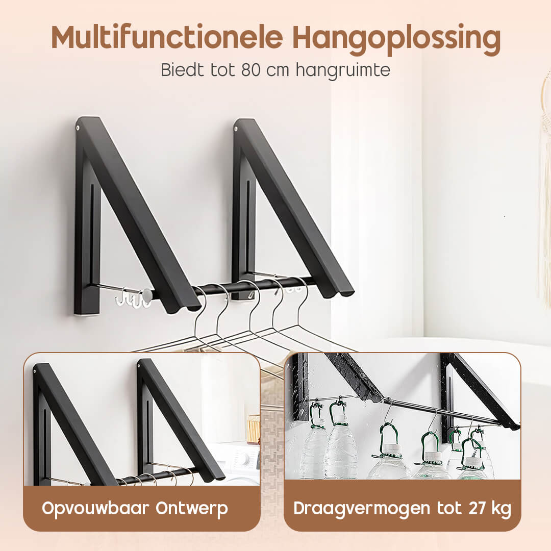 Of het nu gaat om het drogen van was op je balkon, het ophangen van handdoeken in de badkamer of het creëren van extra plek voor jassen in de hal – dit sterke en stijlvolle ontwerp biedt altijd de perfecte oplossing, zonder je kostbare ruimte op te offeren.