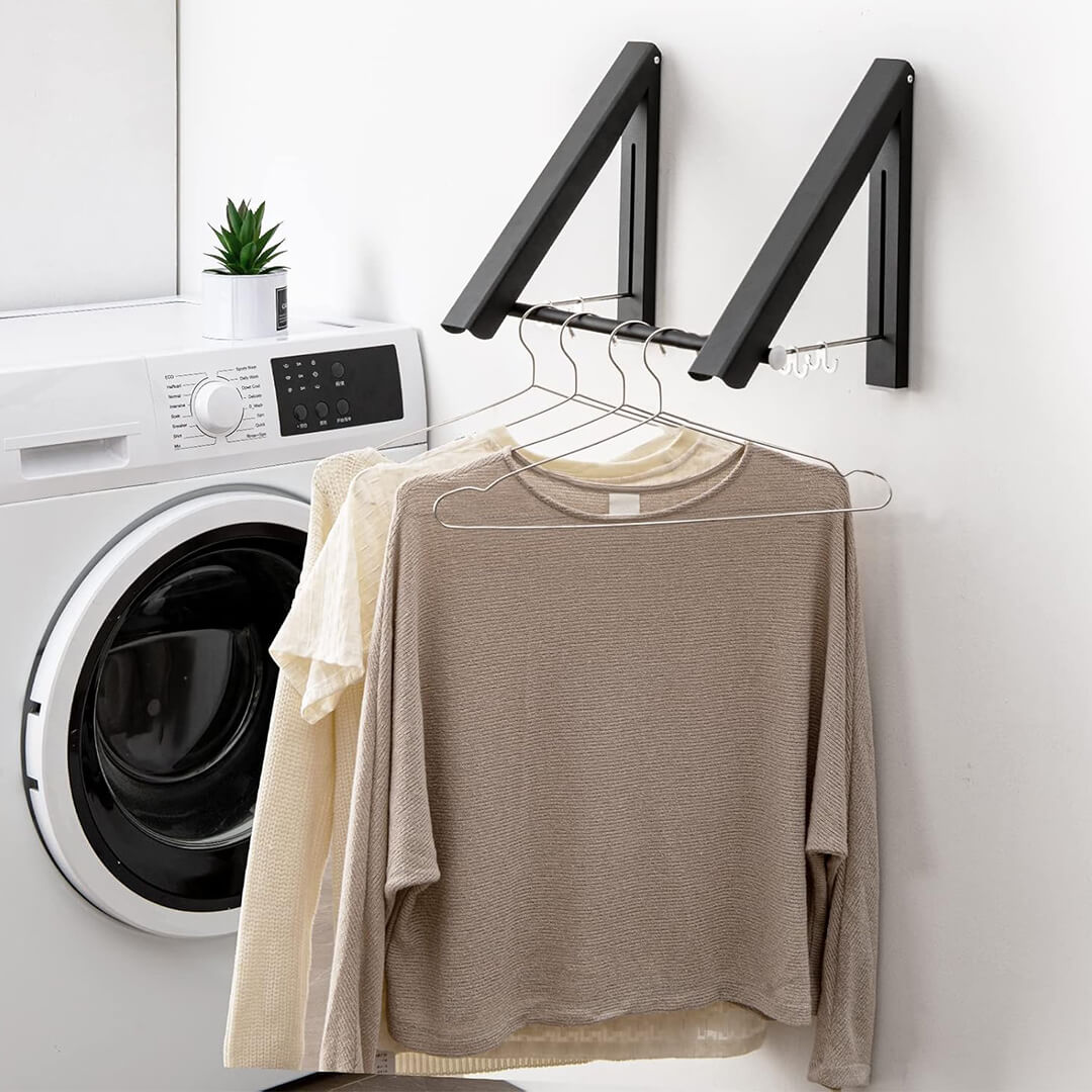 Dankzij het slimme opvouwbare ontwerp en de sterke aluminium constructie met een draagkracht tot 27 kg, krijg je alle ophangruimte die je nodig hebt – en verdwijnt het rek netjes tegen de muur zodra je klaar bent.
